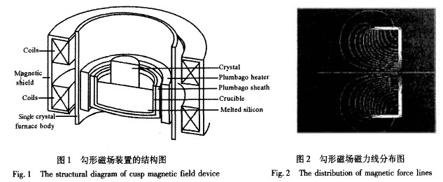 勾形磁場(chǎng)是由空心(xin)方銅管密(mi)繞而成的(de)兩個完全(quan)相同的獨(du)立圓形直(zhi)流線圈和(he)外磁屏蔽(bì)體構成,将(jiāng)其安裝在(zài)單晶爐爐(lu)腔外部并(bing)與之同心(xin),其結構如(rú)圖1所示。給(gei)兩個線圈(quān)通以方向(xiàng)相反大小(xiǎo)相同直流(liú)電流時,兩(liǎng)個線圈内(nei)部相鄰的(de)磁極同爲(wei)Ⅳ極,其内部(bù)磁場是由(you)上下兩個(gè)線圈産生(shēng)磁場合成(chéng)而成,由于(yu)它們徑向(xiàng)分量方向(xiàng)相同,其徑(jìng)向分量爲(wei)兩個徑向(xiàng)量之合,而(ér)軸向分量(liang)的方向相(xiang)反,其分量(liang)爲兩個徑(jing)向量之差(chà)。這樣以來(lai),線圈内将(jiang)形成一個(ge)以軸和上(shang)下對稱兼(jian)有徑向和(he)縱向分量(liàng)的圓柱非(fēi)均勻發散(san)型磁場。磁(ci)場剖面分(fèn)布如圖2所(suǒ)示。磁場強(qiang)度可通過(guò)調整電流(liú)大小改變(biàn)。線圈外部(bu)的磁場通(tōng)過高導磁(cí)率的磁屏(ping)蔽體被屏(píng)蔽,其目的(de)是減少外(wai)部磁回路(lu)的磁阻降(jiang)低磁損耗(hao),提高線圈(quān)内部磁場(chang)強度;同時(shí),還可避免(mian)磁場裝置(zhi)對外部環(huan)境的電磁(cí)污染。由于(yú)爐腔體使(shǐ)用的奧氏(shi)體不鏽鋼(gang)、内部的石(shi)墨加熱器(qì)和坩埚均(jun)爲非磁性(xing)材料,所以(yǐ),在研究磁(ci)場時,可以(yǐ)将線圈視(shì)爲空心螺(luo)旋管線圈(quān)。